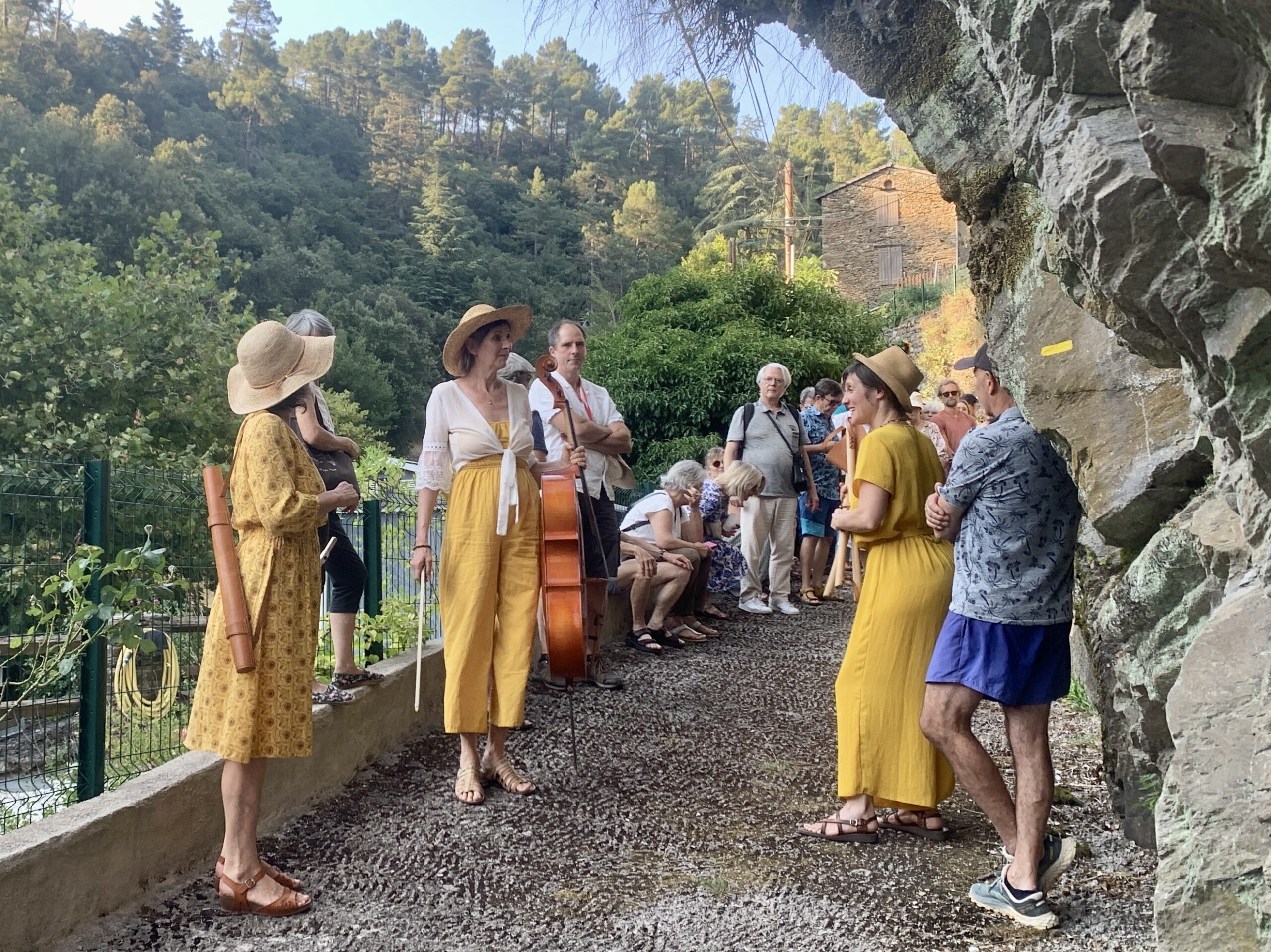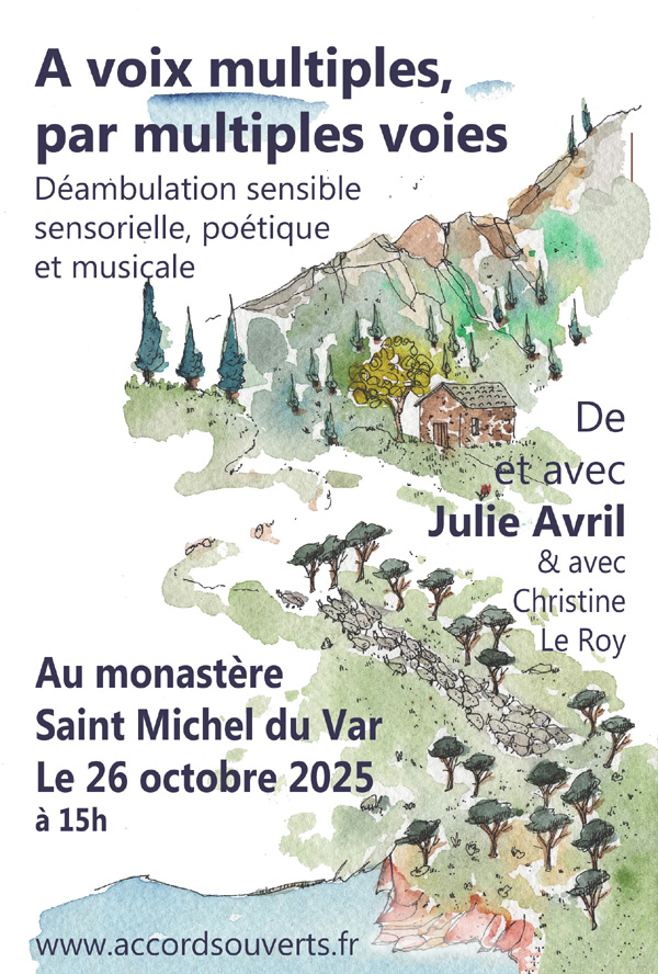 Invité au voyage intérieur, le spec-acteur éprouve l’imprévu, le « hasard » qui guide ses pas, hors des sentiers battus, à la croisée des chemins entre mots, musiques, chants. Il se laisse guider dans une dynamique de relai, de cheminement, avec musiques (violoncelle, flûte traversière, harpe), chants, textes, en polyphonies. Chacun.e est nourri selon son désir par les différentes entrées sensorielles qui font écho à la pluralité des paysages de l’environnement direct. Le spectacle se re-créé in situ et à géométrie variable. Espaces naturels, ruraux, parcs, sites classés, jardins d’exception, deviennent écrins de cette proposition sensible.