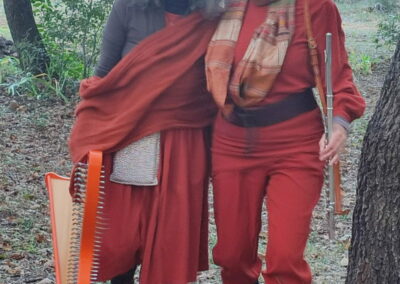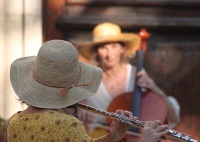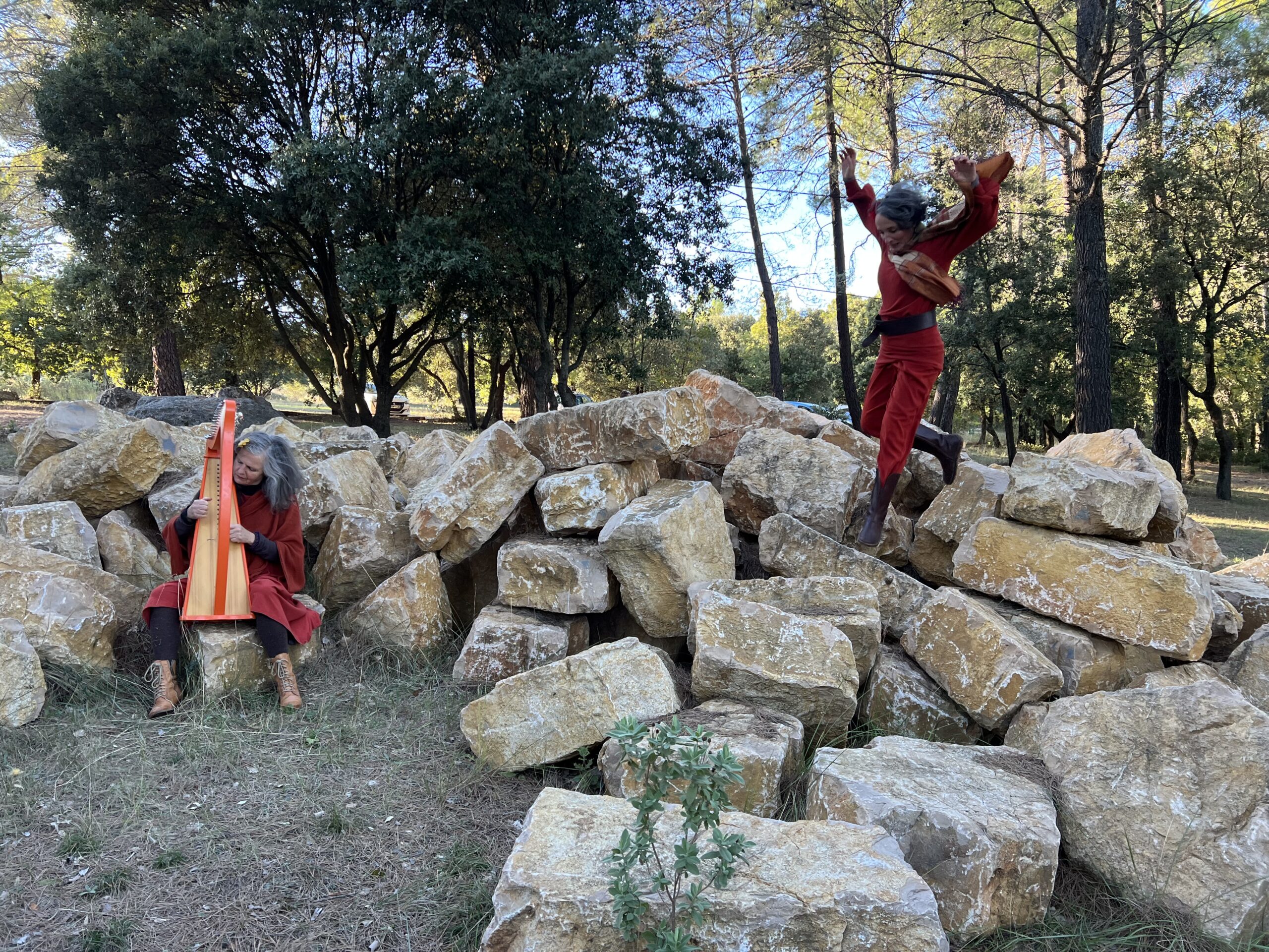 Les chants, inspirés des vocalités du monde, les musiques de couleur modale sont composés et arrangés par Julie et Christelle. Polyphonies, langage imaginaire. Mélodies simples, répétitions devenues ritournelles portent les déplacements qui semblent processions. Place est laissée à l’improvisation qui accueille ce qui se passe « ici et maintenant », réunissant public, artistes, sons environnants, acoustique des lieux. Cette approche implique de se familiariser avec le territoire, repérer le champ des possibles dans les différents espaces, l’ambiance, l’acoustique.