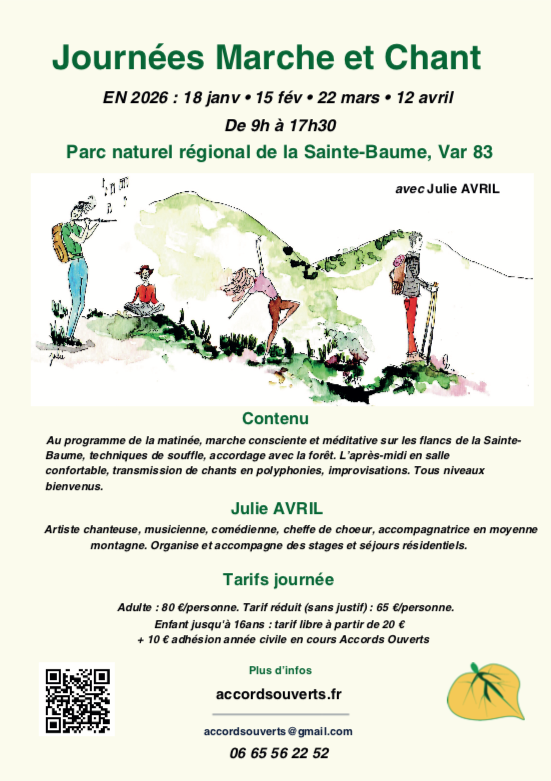 Il y a une page agenda sur le site depuis peu, une page médias en chantier avec la chaine YouTube de Accords Ouverts, des interviews et à venir diaporamas, articles. Prochaine journée Marche & Chant de la sainte Baume à la Source des Anges dimanche 18 janvier